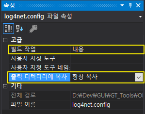 아래 속성을 지정해주지 않으면 빌드 시 환경설정 파일이 출력디렉토리에 복사되지 않기 때문에 실행했을 때 환경설정을 읽어오지 못하게 되니 반드시 적용해주세요.