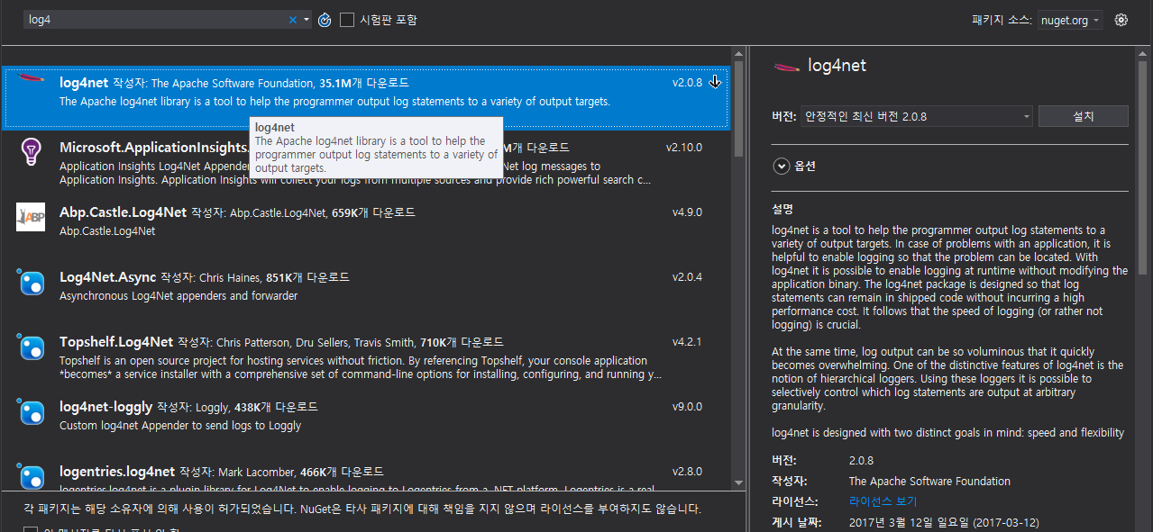 nuget 에서 log4net (Apach Software Foundation)을 검색하여 적용하고자 하는 프로젝트에 설치합니다.