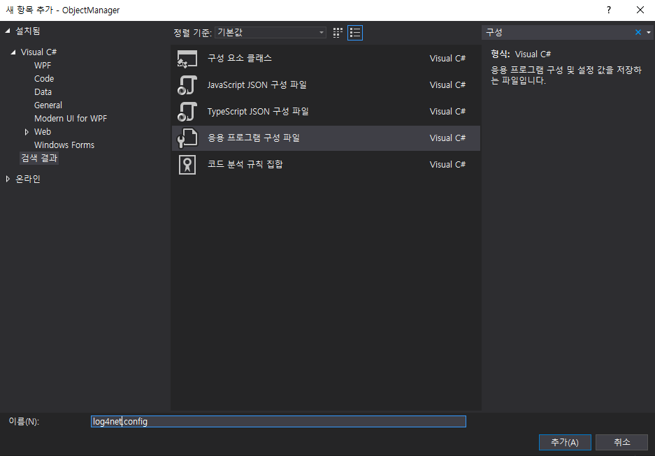파일명을 log4net.config 로 변경한 다음 추가를 클릭합니다.