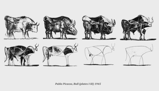 아래의 그림은 오랜 기간 황소를 관찰하고 그림을 그리면서 핵심적인 특징만 남겨두고 제거해나간 과정입니다.